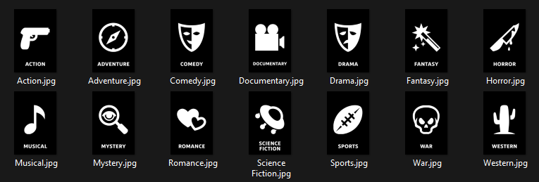 I've been an avid user of various home media software and for the last few years I have used PLEX a lot. I have gone and created over 150 icons to use as posters for your Genre Collections and what I call "Letter Dividers" - Think of them as the plastic separators that would stick out of the shelf at Blockbuster. Each JPG is 1000x1500, fitting into the PLEX expected aspect ratio for Collections.